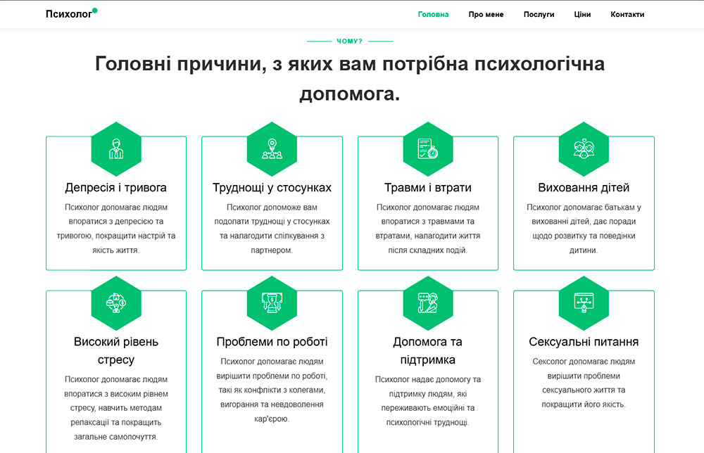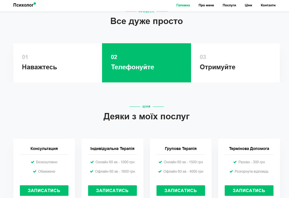 Сайт визитка психолога, предоставляющего услуги онлайн и офлайн психотерапии.