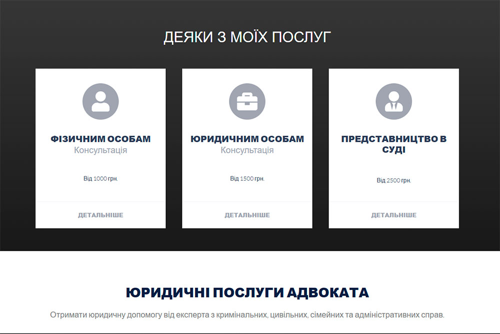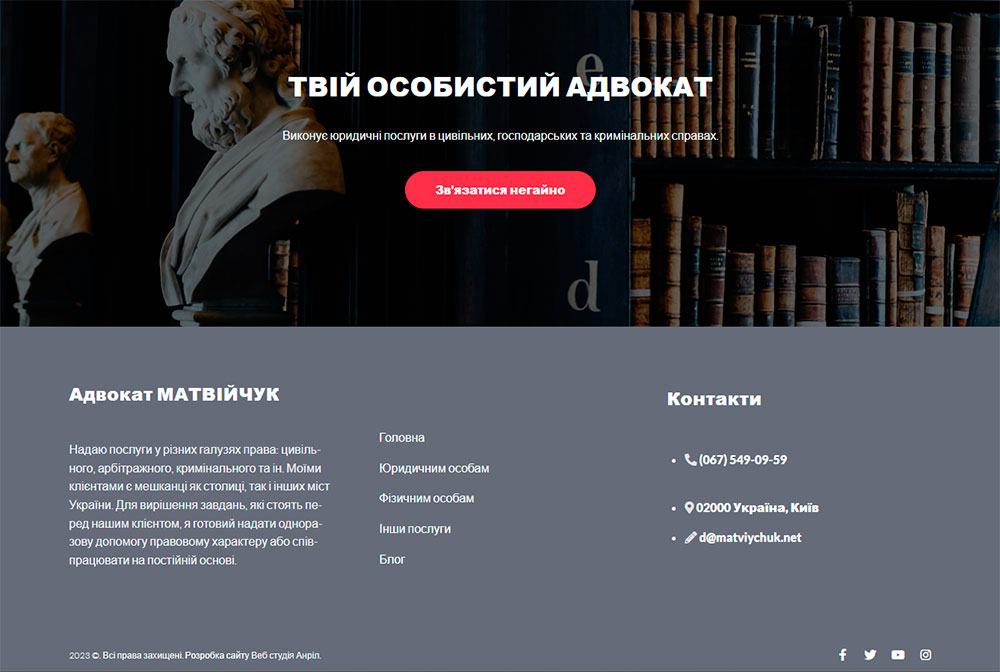 Сайт-визитка адвоката Дмитрия Матвийчука, предоставляющего юридические услуги гражданам и юридическим лицам в Киеве и по всей Украине.