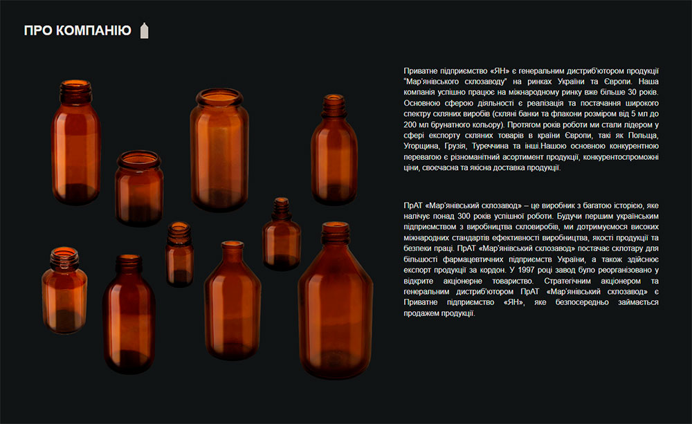 Сайт Частного предприятия «ЯН», которое является генеральным дистрибьютором и поставщиком стеклянной тары от «Марьяновского стеклозавода» (первого украинского предприятия по производству стеклоизделий).