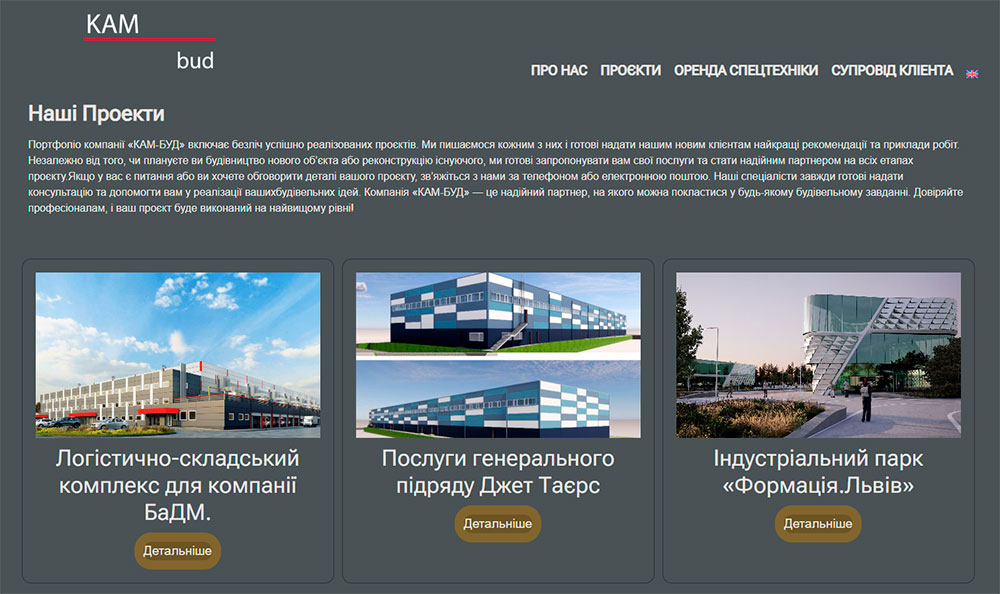 Сайт-портфолио строительной компании «КАМ БУД», разработанный для демонстрации выполненных проектов и привлечения новых заказчиков.