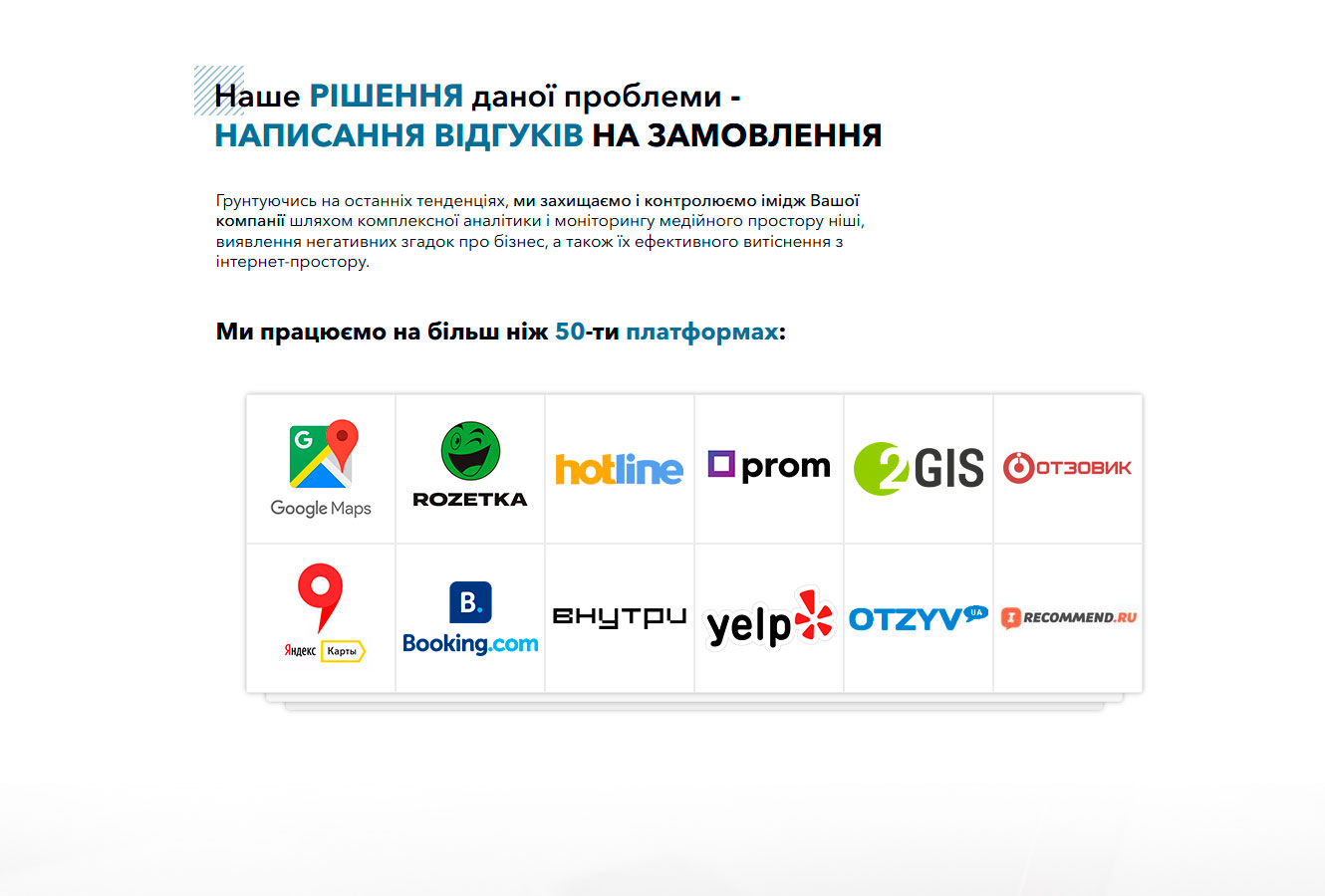 Написание отзывов на заказ для более чем 50 платформ, включая Google Maps, Rozetka, Prom, Hotline, Booking, 2GIS и Отзовик.